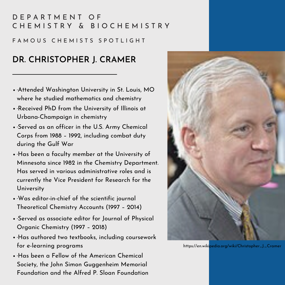 Chemists have also served our country in the military. One example is Dr. Chris Cramer, a computational chemist who most recently was the Vice President for research for the University of Minnesota. Here is a little information about him: