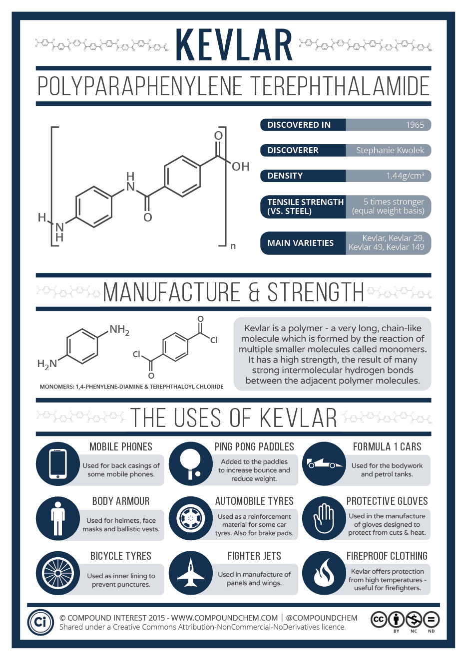 Chemistry also protects our troops. Kevlar, a material used in protective armor, is a polymer, or long chain of repeating units (monomers), just like the plastic used in plastic bottles. However, the structure imparts better strength compared to the plastic in bottles. Kevlar was discovered by Stephanie Kwolek. This great infographic on Kevlar comes from http://www.compoundchem.com: